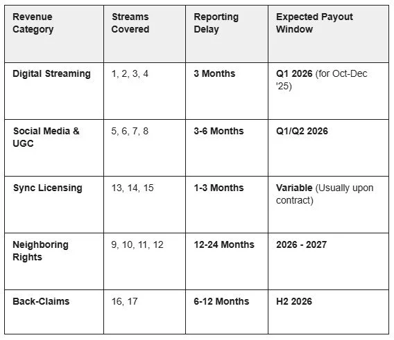 This Revenue Calendar visualizes the standard "payout lag" in the music industry. It helps explain why consumption happening today doesn't necessarily reflect as cash in the bank for several months.